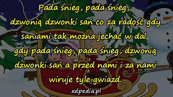 Pada Snieg Jingle Bells Music Lessons By Darek from www.musiclessonsbydarek.pl Pada śnieg, pada śnieg dzwonią dzwonki sań co za radość, gdy saniami można jechać w dal pada śnieg pada śnieg dzwonią dzwonki sań a przed nami i nad nami wiruje tyle gwiazd. Mój opis na temat tekściarstwa przynosi informacje czy tekściarze są w ogóle potrzebni w branży. Pokaż więcej tekstów piosenek wykonawcy made in poland wraz z tłumaczeniem.