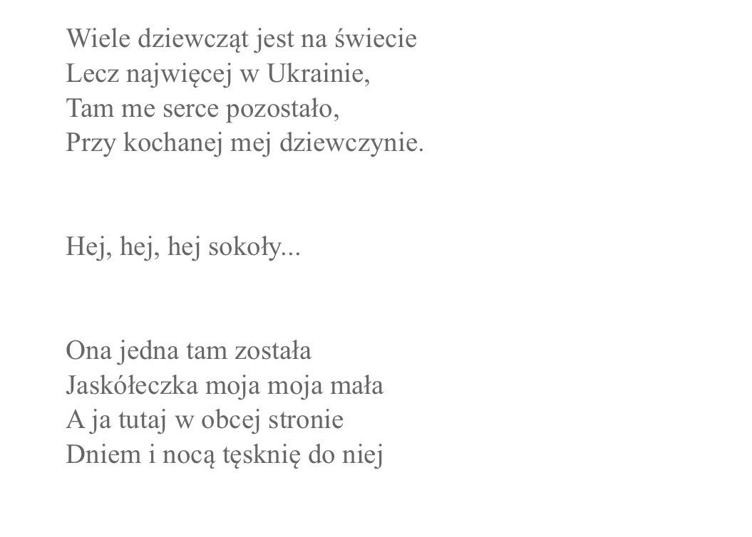Tekst Piosenki Hej Sokoły. Hej tam gdzieś nad czarną wodą siada na koń kozak młody czule żegne się z dziewczyną jeszcze czulej z ukrainą. Hej, tam gdzieś znad czarnej wody siada na koń kozak młody, czule żegna się z dziewczyną, jeszcze czulej z ukrainą.
