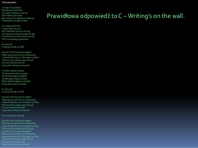 Na Groovepl znajdziesz najdokładniejsze tekstowo tłumaczenia piosenek w polskim Internecie. Erich wzion tydzień urlopu z werku zrobił krupnioków i frankfuterków. Znasz już tekst piosenki Writings On The Wall Zobacz tłumaczenie tekstu piosenki Writings On The Wall na polski.