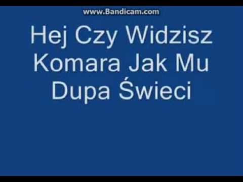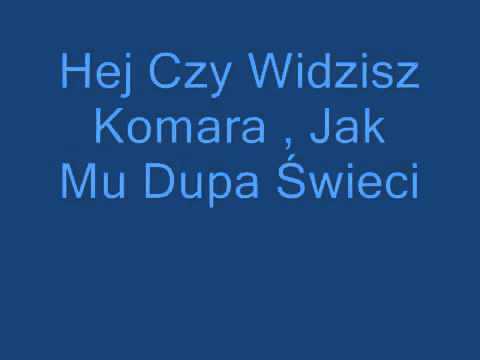 Hej czy widzisz komara jak mu dupa świeci. Przy mu gazetą on wyżej nie poleci. Lata komar lata lata cały dzień.